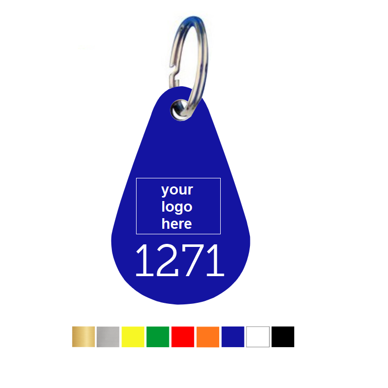 Strong plastic key tags, teardrop shaped with a custom logo and number engraving.
